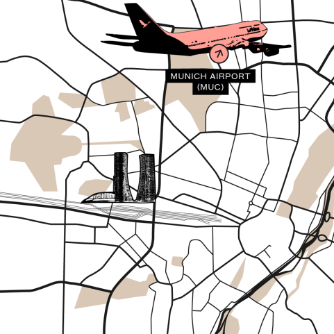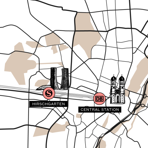 The nearby Hirschgarten S-Bahn station provides a five-minute connection to the central station. From there, the S1 and S8 lines run every 10 minutes, taking approximately 40 minutes to reach the airport. Alternatively, the Lufthansa Express Bus departs every 20 minutes from the central station, reaching the airport in about 45 minutes.