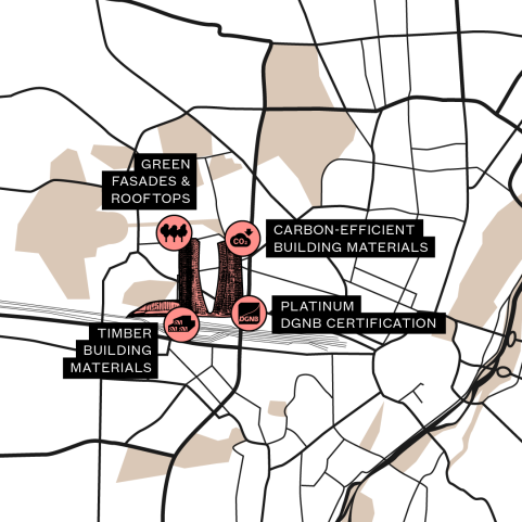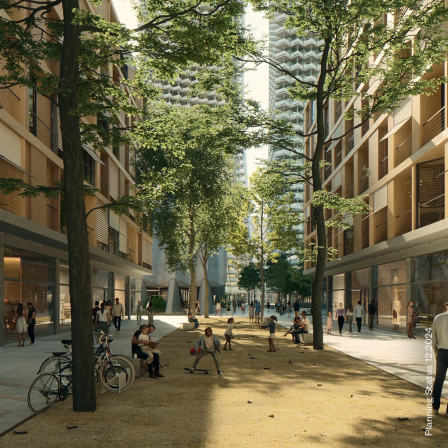 Inviting promenades and wide alleys lead into open courtyards, creating a continuous green corridor through the district. Playgrounds, sports facilities, and recreational spaces enhance the quality of life, while dynamic landscape architecture encourages people to pause and connect. At the same time, it provides a natural buffer between residential and office areas. Here, architecture transforms into an open and welcoming space for all.
